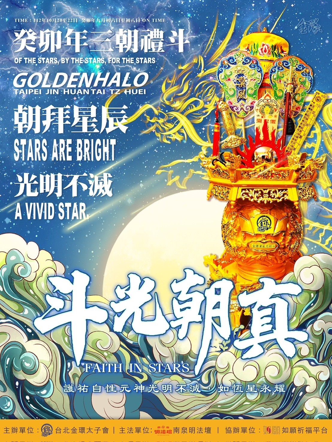 有人說,我們都來自於「星星」,此一說並非只是浪漫幻想,而是其來有自。道教認為,人最終的歸宿為「斗府」,而我們當然也來自於此,斗即星宿,也是每一個人的本命元辰。「禮斗」為朝拜自己本命元辰,使元辰光彩,祛災趨福,祈求平安添福。禮斗道壇上,經過金環眾神慈悲加持,我們自身誠心奉禮祈請五斗神光,得以消除罪業,福壽臻身,護祐自性元神光明不滅。